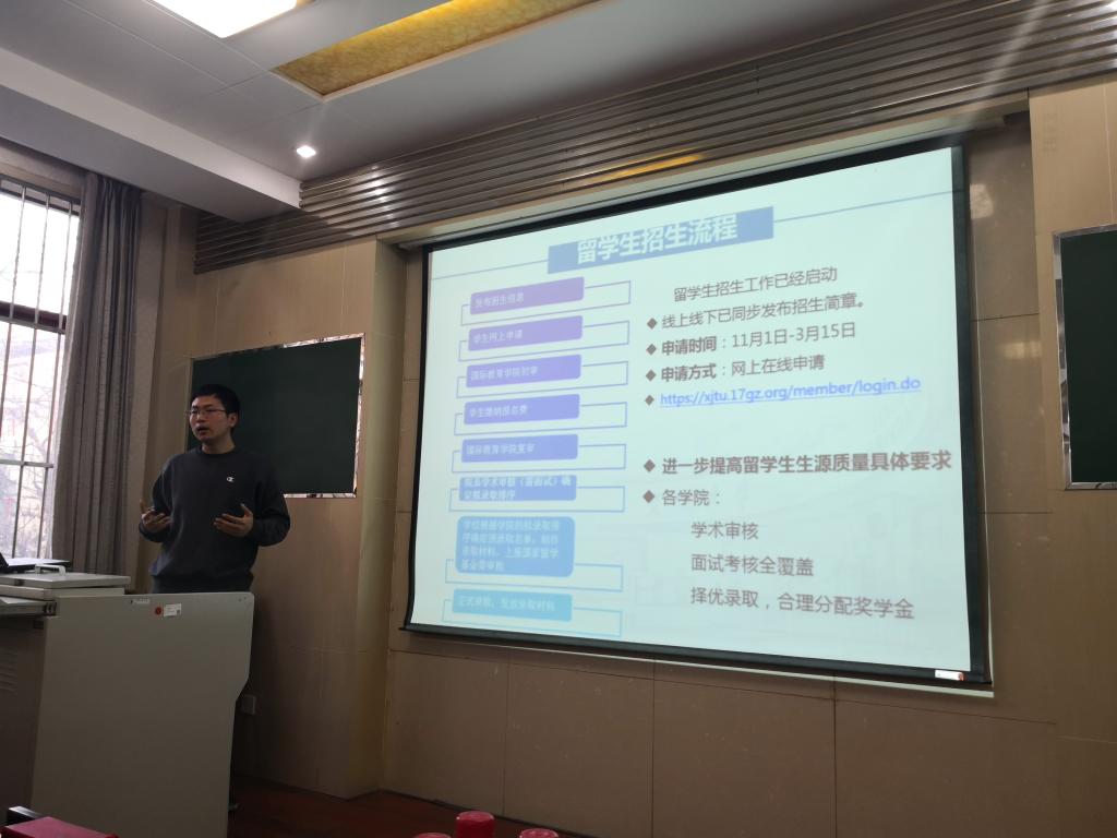 接着,温广瑞教授代表国际教育学院全面介绍了全校留学生近年来的招收情况,他特别强调,世界一流高校的留学生数量一般占全校总学生数的10%以上,而目前我校还需要加大力度,提升留学生占比;此外,将各学院横向比较来看,世俱杯官方网站有极大的潜力招收和培养更多的留学生,为建设“双一流”做出贡献。为了使老师们更加透彻地理解留学生招收细则,国际教育学院招生办马腾老师,向大家介绍了从学生开始申请到学生来校报到所需完成的步骤和申请流程,留学生奖学金的设置,并解答了现场教师在实际工作中所遇到的困惑。