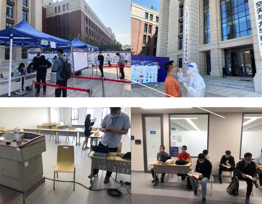 5月15日,学院对考生进行了现场资格确认以及复试考场布置。为了避免学生聚集,做好防疫保障工作,工作人员组织学生分时段前来现场确认,同时委托彭年才教授联系了天隆科技天博医学检验所,为来自中高风险地区的考生进行了免费专业核酸检测。15日下午,场内工作人员进行了现场布置,做好现场的技术保障工作;场外工作人员为考生准备了口罩、免洗消毒洗手液、消毒湿纸巾,做好现场的防疫保障工作。