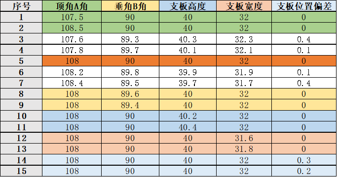 在顶角、垂角、总高三个尺寸上对角片1进行区分,参考零件为5号,顶角108度,垂角90度,总高40mm。顶角分为107.5度和108.5度两种;垂角分为89.6度和89.4度两种;支板高度分为40.2mm和40.4mm两种;支板宽度分为31.6mm和31.8mm两种;支板位置偏差分为0.2mm和0.3mm两种。除此之外,设置四个非控制变量组,即每个尺寸都有所变化,非控制变量组的零件尺寸变化可以与控制变量组的零件形成尺寸变化趋势,可以达到6组实验数据,满足实验要求。上述非控制变量组零件中,较相似的3号和7号零件与参考零件区别为顶角±0.4度,垂角0.7度和0.5度,支板高度±0.3mm,支板宽度±0.3mm,支板位置偏差均为0.4mm。极相似的4号与6号零件与参考零件的区别为顶角±0.2度,垂角0.3度和0.2度,支板高度±0.1mm,支板宽度±0.1mm,支板位置偏差均为0.1mm。上述零件总计15种。