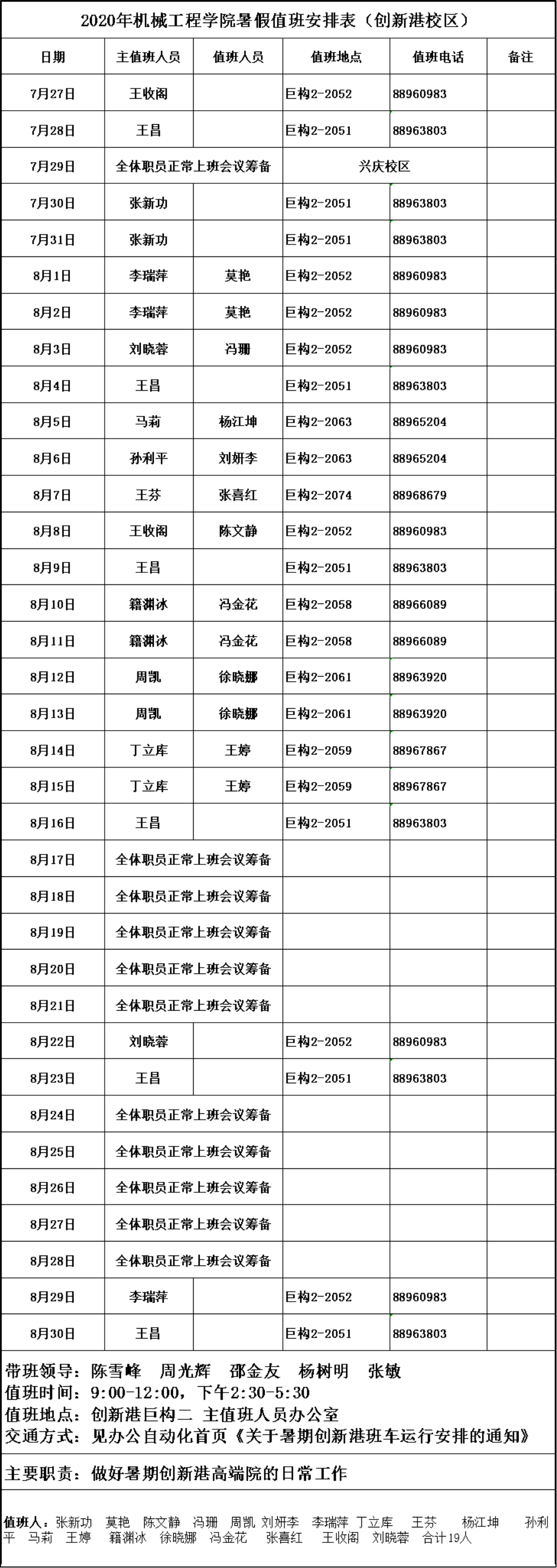 2020年世俱杯官方网站暑假值班安排表(创新港校区)