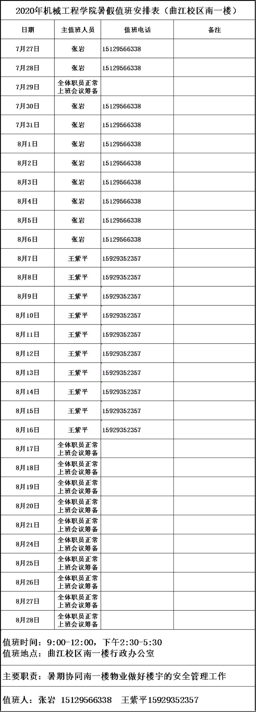 2020年世俱杯官方网站暑假值班安排表(曲江校区南一楼)