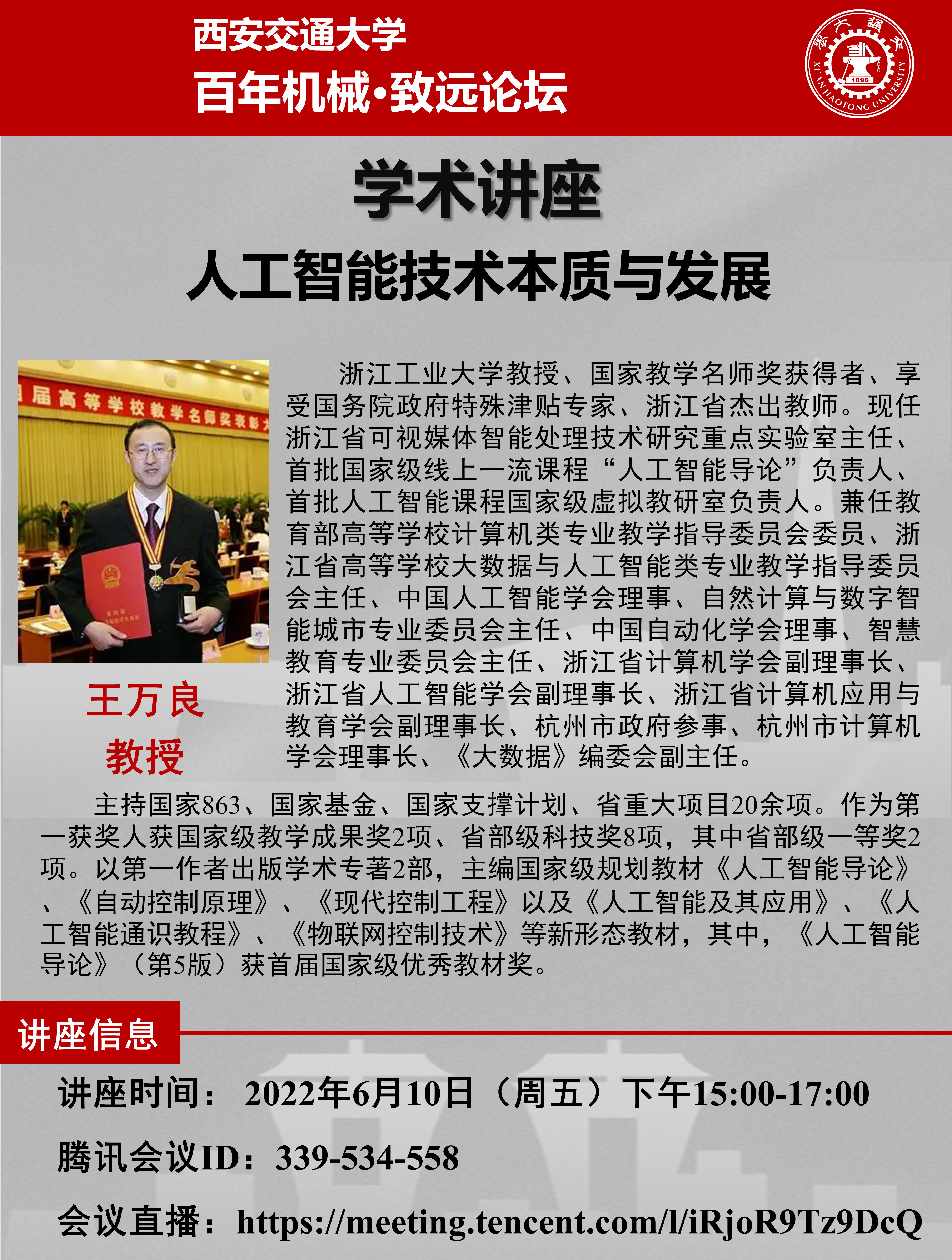 王万良教授,浙江工业大学教授、国家教学名师奖获得者、享受国务院政府特殊津贴专家、浙江省杰出教师。现任浙江省可视媒体智能处理技术研究重点实验室主任、首批国家级线上一流课程“人工智能导论”负责人、首批人工智能课程国家级虚拟教研室负责人。兼任教育部高等学校计算机类专业教学指导委员会委员、浙江省高等学校大数据与人工智能类专业教学指导委员会主任、中国人工智能学会理事、自然计算与数字智能城市专业委员会主任、中国自动化学会理事、智慧教育专业委员会主任、浙江省计算机学会副理事长、浙江省人工智能学会副理事长、浙江省计算机应用与教育学会副理事长、杭州市政府参事、杭州市计算机学会理事长、《大数据》编委会副主任。