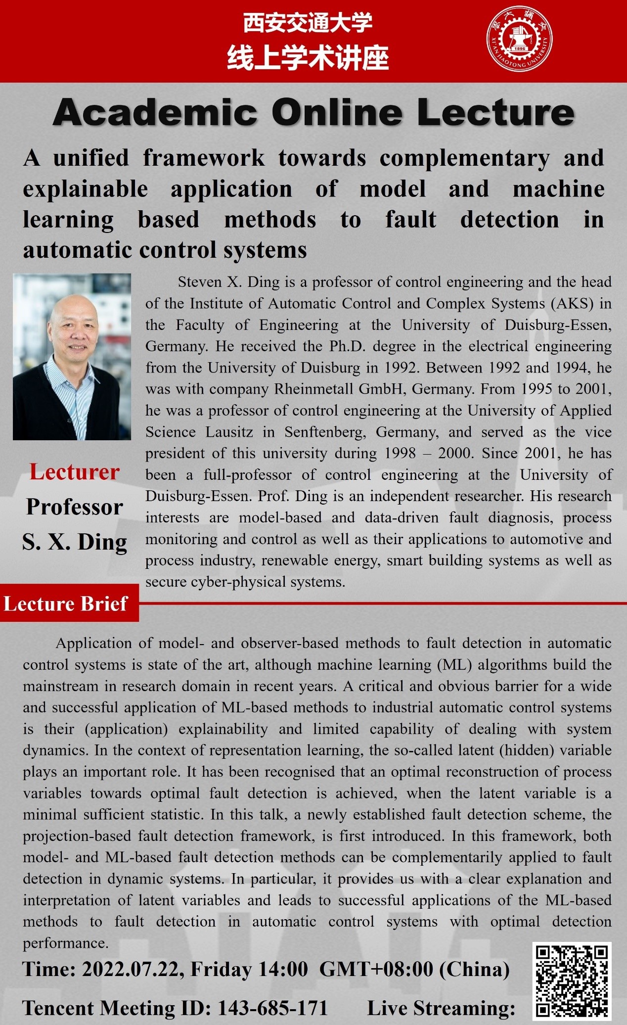 讲座题目:A unified framework towards complementary and explainable application of model and machine learning based methods to fault detection in automatic control systems