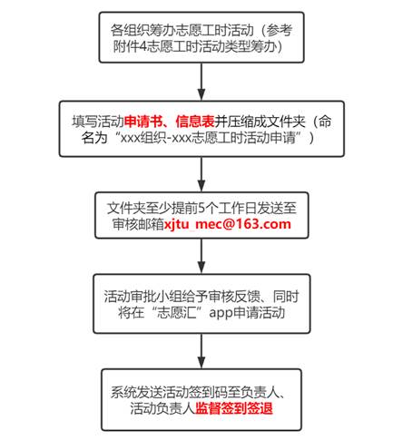 1、各级学生组织按照要求填写志愿活动申请书(附件1)与志愿活动信息表(附件2),并将二者以压缩文件夹(命名为“xxx组织-xxx志愿工时活动申请”)的形式提交至学院研究生会志愿服务活动审批小组电子邮箱xjtu_mec@163.com。