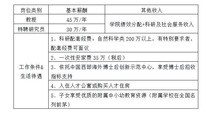 长期招聘在世界一流大学(科研机构)任职的教授、国家重大人才项目入选者或学术水平与以上人才相当的各类高层次人才。薪酬待遇实行一人一议,将视引进人才的实际科研工作需要,在协议薪酬、实验室空间、团队配备、博士生招生指标等方面给予充分支持,做到一流人才、一流保障。