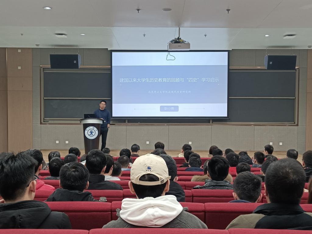 马克思主义学院靳小勇老师开展主题为“建国以来大学生历史教育的回顾与‘四史’学习启示”的党课讲座。靳小勇老师将建国以来分为社会主义建设年代和改革开放新时期两个时期,同全体发展对象一起对两个时期的大学生历史教育进行详细回顾。社会主义建设年代的大学生历史教育特点是革命史、党史教育模式交替演变,在改革开放新时期,大学生历史教育更加注重为社会主义“四化”人才培养而服务。靳小勇老师介绍了“四史”学习及启示,即要以“四史”学习提升对近现代中国社会革命、建设、改革的历史进程及其内在规律性的认识、深刻领会历史和人民的“四个选择”;“四史”学习应坚持理论历史和社会历史并重、二者须在融会贯通中实现有机统一;“四史”学习应重视经典阅读和学习,从经典中汲取力量和自信。