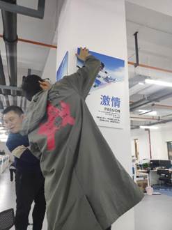 之后大家便找到自己的位置开始装钉,装钉的过程中困难重重,锤子不够给力、墙太硬、钉子不够…,但这并没有让大家气馁,罗丹书记也一直在帮大家出谋划策,同学们之间也在互相帮助,完成自己任务的同学也会主动去帮助进度慢的同学,经过了大约两个小时的劳动,终于完成了所有文化板的装钉任务。