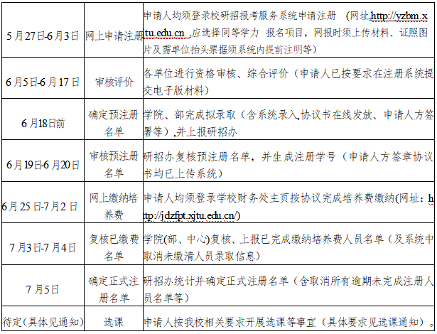 经研招办审核通过的申请注册人按照协议及接收单位具体通知要求,均须于6月25日-72登录校财务处主页完成培养费网上缴纳(网址:http://jdzfpt.xjtu.edu.cn/)且本人保留缴费凭证截图以备查。按时在学校收费平台完成培养费全额缴纳后,本次申请方可生效。逾期未按时网上全额缴纳培养费者,均视为本人放弃本次注册。