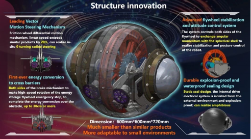 项目介绍:产品采用全球领先的重摆偏心飞轮自稳驱动机构,基于卫星飞轮三轴姿态稳定控制技术,采用重摆偏心驱动方式,利用飞轮与球壳角动量交换进行非线性动力学模型构建以实现增稳和姿态控制,大幅提高球形机器人机动性能;同时本产品采用全域静密封技术,解决传统机器人动密封改造成本高的问题,有效隔绝外部复杂环境对机器人动力及电气系统影响,全方位提高了巡检机器人的安全性和工作效率。项目的应用领域广泛,包括工厂巡检、井下巡检监测、环境监测、矿山排查等,具有广泛前景。