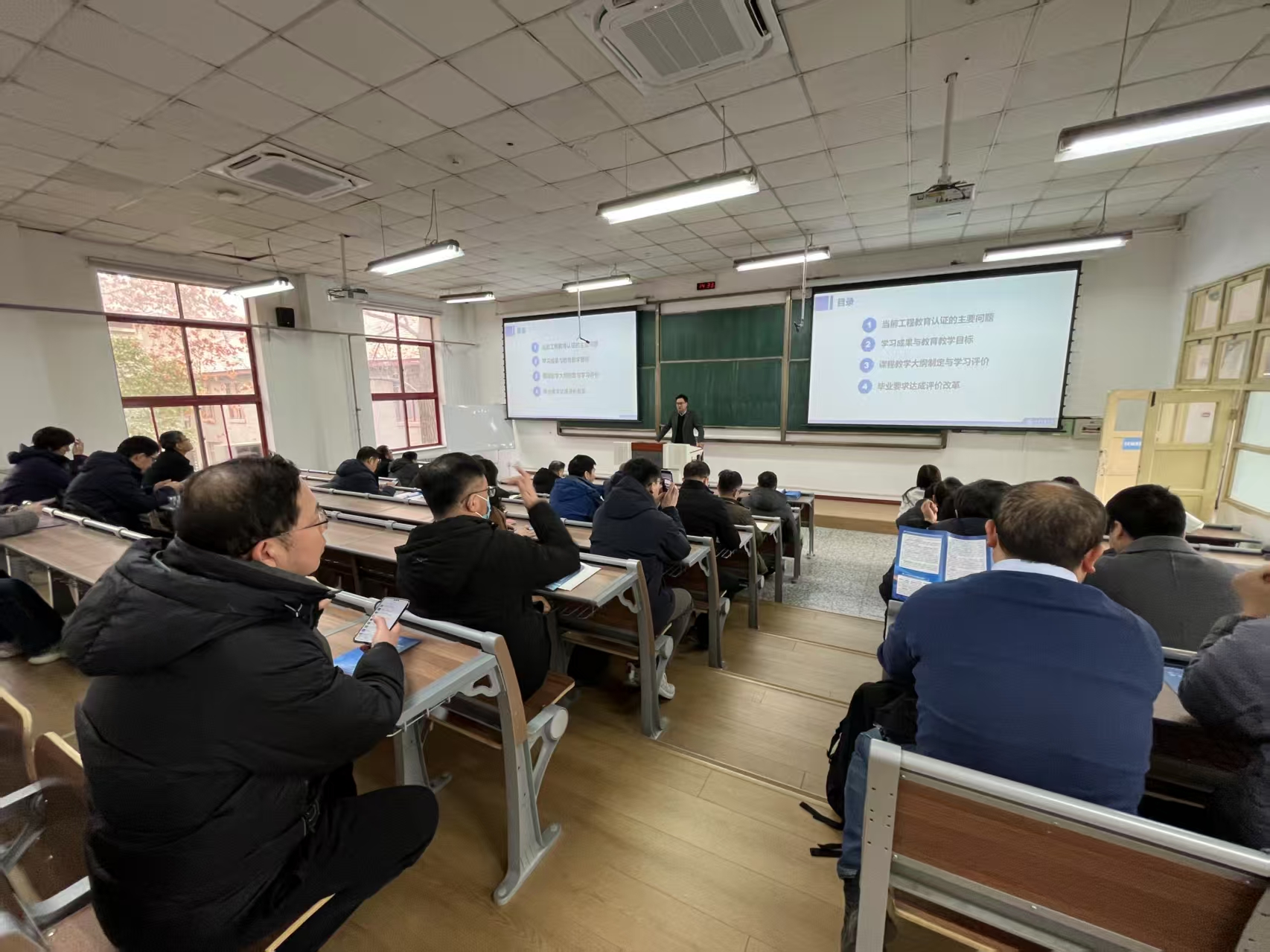 王永泉副院长通报了学院一体化推进审核评估和专业认证的工作方案,宣讲了新一轮审核评估和专业认证的新变化、新要求,并以专业认证的新趋势为切入点,详细解读了国际工程联盟毕业要求和职业能力(GAPC)标准修订的最新动态,剖析了当前工程教育认证过程中存在的主要问题和改进方向,并通过深入探讨学习成果与教育教学目标之间的内在联系,就课程如何在成果导向的理念和框架下,科学制定课程大纲、精准评价课程目标的达成程度,并通过多样化的考核手段和评价、分析方法开展毕业要求达成评价进行了详细讲解和规范化培训。他还通报了学院在审核评估和专业认证方面的工作进展,介绍了机械工程专业响应机械类专业认证委员会要求,推进毕业要求达成评价改革的思路和举措。